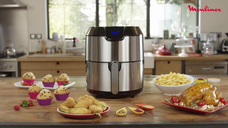 Freidora de aire, sin aceite, 16 funciones, 8 programas, ahorro energético, APP Moulinex, 4,2 L, diseño compacto, cocina saludable.