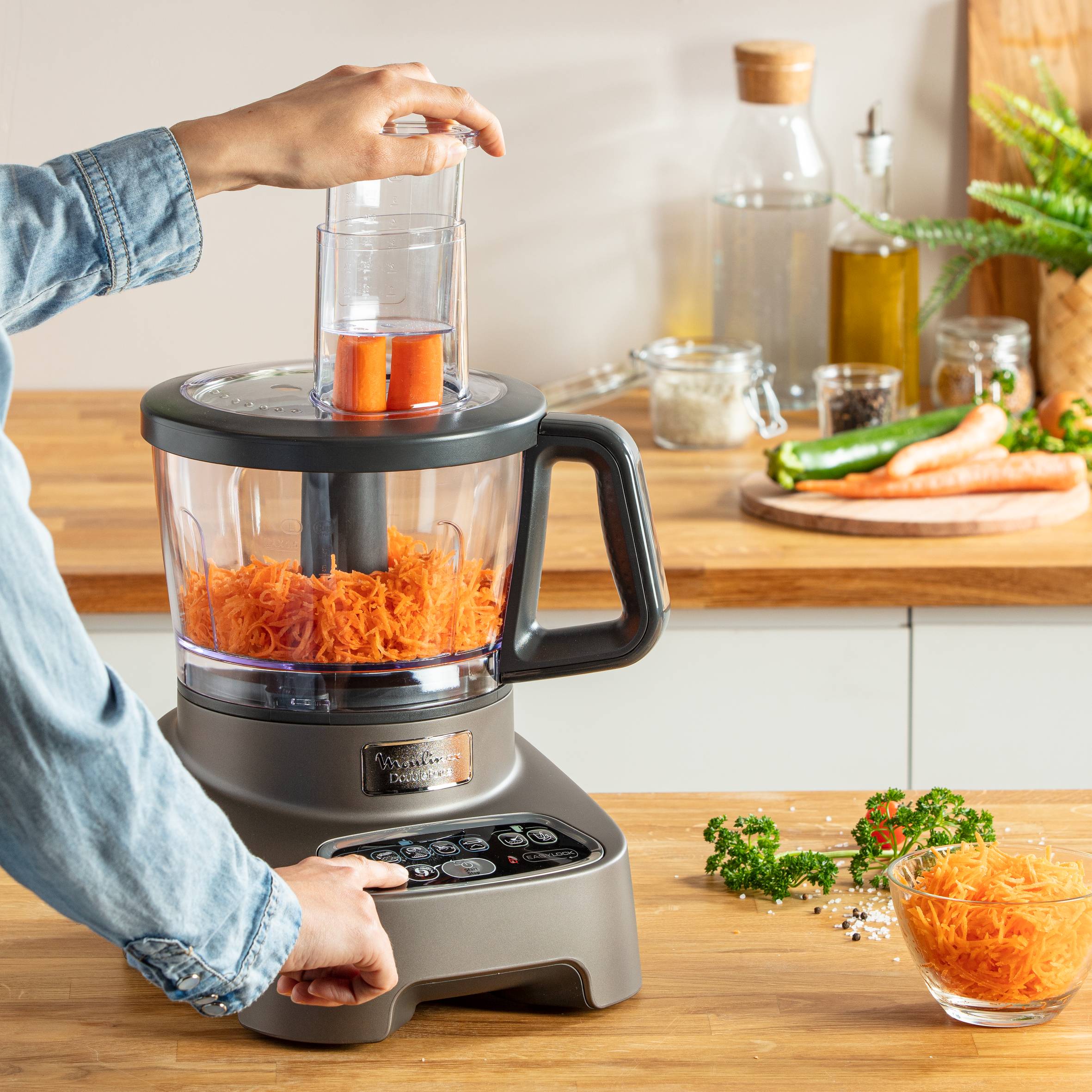 El procesador de alimentos multifunción DoubleForce de Moulinex está equipado con dos opciones de potencia de motor que da como resultado una herramienta que garantiza la combinación de velocidad y potencia para satisfacer todas tus necesidades culinarias. La interfaz altamente intuitiva pone al alcance de tu mano un control total para obtener siempre resultados óptimos.
