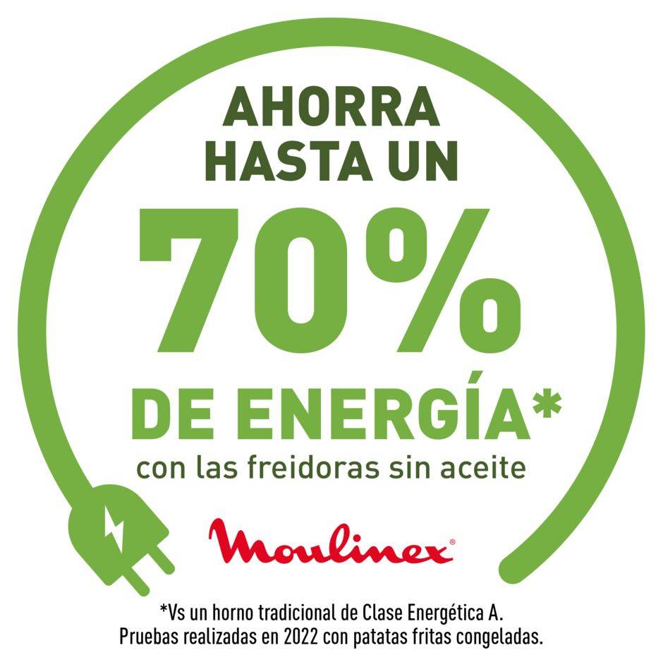 COCCIÓN RÁPIDA Y SIN ACEITE: con la air fryer Moulinex disfruta de unos resultados más crujientes con poco o sin aceite y un 49% más rápidos que un horno clásico. Platos más saludables y llenos de sabor en cuestión de minutos TECNOLOGÍA GRILL: descubre su parrilla de aluminio fundido a presión y antiadherente para conseguir desde carnes tiernas y jugosas hasta verduras asadas con todo el sabor AHORRO ENERGÉTICO: Ahorra hasta un 70% de energía* con nuestras freidoras sin aceite. Cocina más rápida, más económica y menor consumo de electricidad. FÁCIL DE USAR: sus 8 programas preestablecidos permiten una gran variedad de preparaciones de manera fácil, rápida y sana. Además, su pantalla digital intuitiva te brinda una mayor comodidad, con tiempo de cocción y temperatura ajustables APP GRATUITA MY MOULINEX: disfruta de más de 2000 recetas de inspiración para tu día a día gracias a la aplicación gratuita My Moulinex. CAPACIDAD 4,6 L: Con una generosa capacidad de 4,6 litros, esta freidora de aire satisface las necesidades de toda la familia, ideal para hasta 6 personas. DISEÑO COMPACTO Y SEGURO: Freidora de aire compacta y moderna que se adapta a cualquier cocina. Su mango de tacto frío permite que sea más segura, incluso para niños y personas mayores