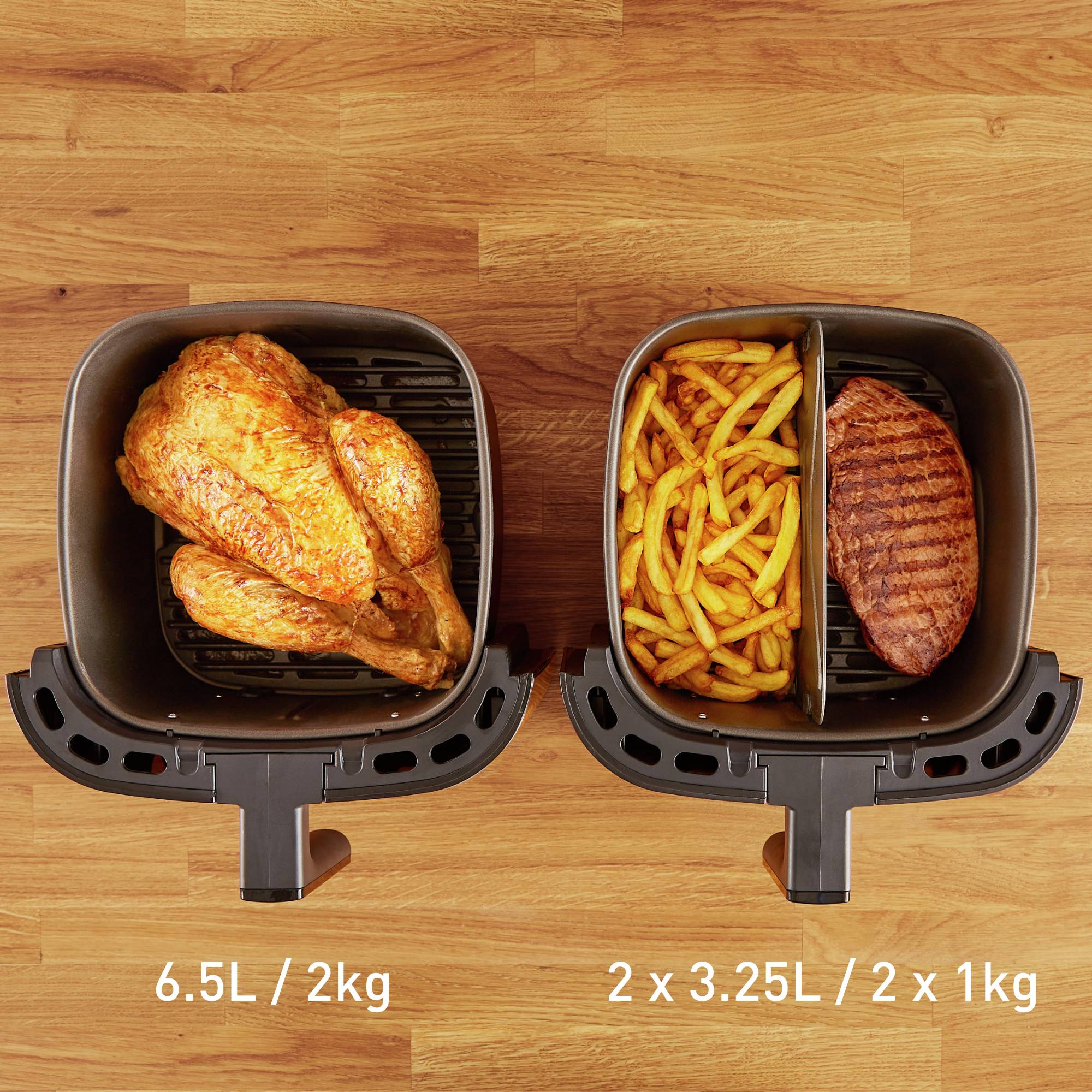 Freidora de aire 2 en 1, dos platos a la misma vez, tamaño XXL, 6.5L de capacidad, parrilla antiadherente y resistente, divisor Flexcook para cocción dual, ahorro energético, APP Moulinex gratuita, resultados crujientes y saludables, 8 programas preest...