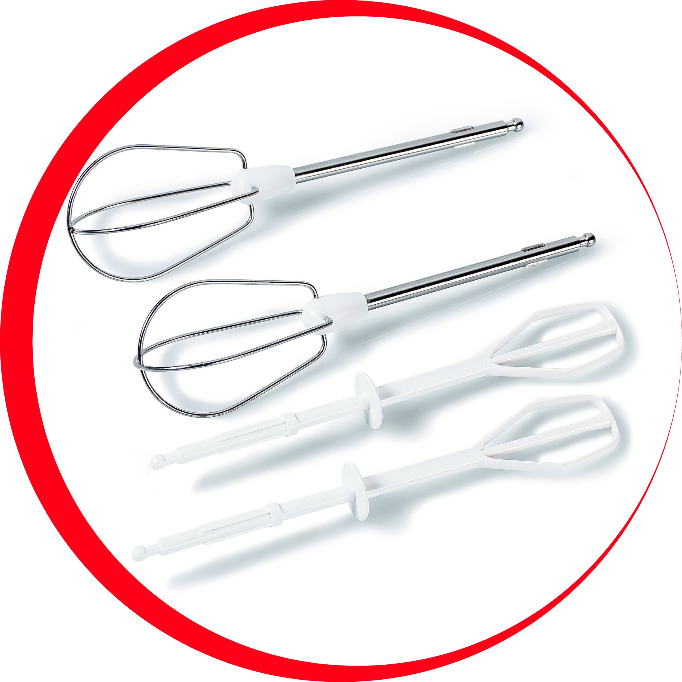 Gracias a sus 200 W de potencia y a sus 5 velocidades, podrás batir claras con facilidad y montar nata usando los 2 sets de varillas que se incluyen (plástico y acero inoxidable).