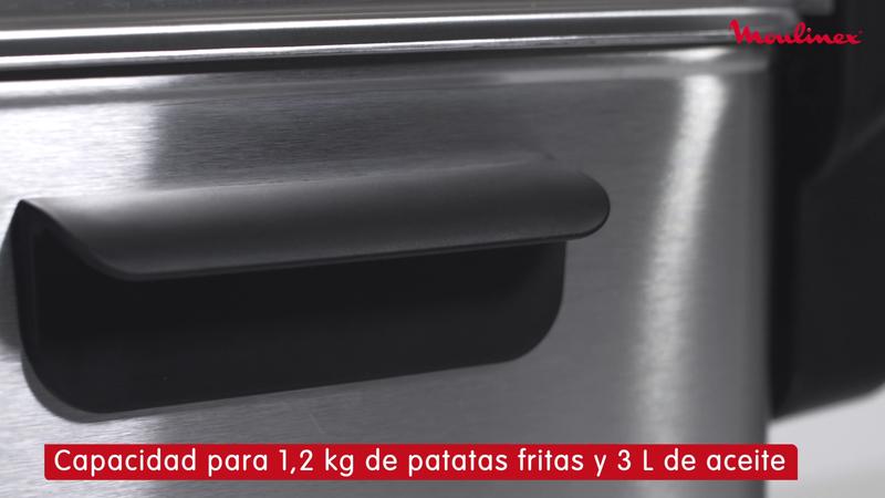 Capacidad: 3 L de aceite / Hasta 1,2 kg La tecnología de zona fría debajo del elemento de calefacción evita la combustión de las migas. Ayuda a mantener el aceite limpio Tapa de cocina con ventana de visualización para controlar fácilmente nuestra fritura Piezas extraíbles y lavavajillas (excepto parte eléctrica) Sistema de calefacción rápido Temperatura ajustable: de 150 °C a 190 °C Tazón de acero inoxidable y acabado del cuerpo Asas de transporte Cesta extraíble