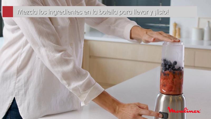 La minibatidora Mix & Move de Moulinex, que ofrece un batido perfecto en un formato compacto, permite crear de forma excepcional todos sus batidos, bebidas proteínicas y licuados favoritos, con un par de cómodas botellas para disfrutar de tus creaciones frescas y deliciosas en cualquier lugar. Dos prácticas botellas de Tritan de alta calidad, con capacidades de 0,6 L, ofrecen el formato ideal para llevar tus batidos a cualquier parte. Ya sea en el patio, en el trayecto matutino al trabajo o al salir a correr, esta licuadora personal para batidos y smoothies es perfecta para llevarla a cualquier parte, tanto solo como en compañía. La movilidad va acompañada de prestaciones y características ingeniosas: un diseño compacto y aerodinámico para guardarlo sin esfuerzo, cuchillas extraíbles de fácil limpieza, 300 W de potencia para obtener resultados suaves y cremosos en un abrir y cerrar de ojos, y un mando ergonómico de un solo botón para batir perfectamente con total facilidad y comodidad.