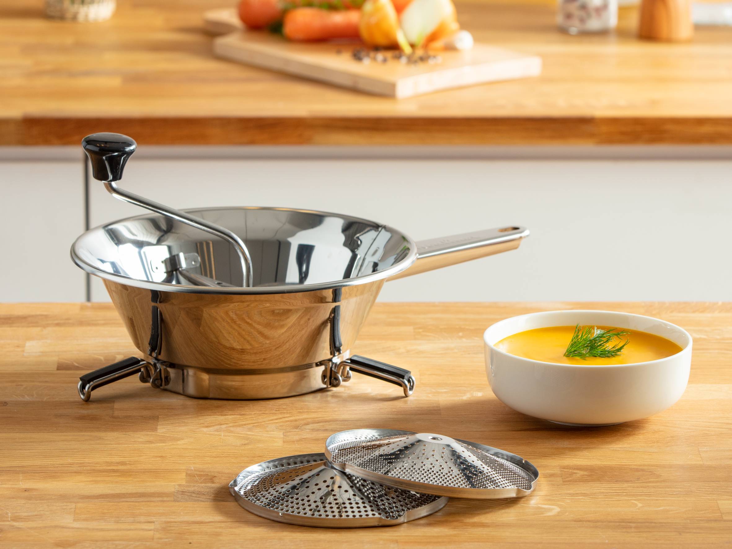 Triturador de verduras grande fabricado en Francia con calidad y artesanía de primera Diseño apto para el lavavajillas para una limpieza fácil Uso versátil: ideal para preparar purés, sopas y compotas con facilidad 2 rejillas de acero inoxidable para hacer purés finos o medios Patas antideslizantes y plegables que ofrecen comodidad y facilidad de almacenamiento Adecuado sobre cuencos y ollas de hasta 24 cm de diámetro