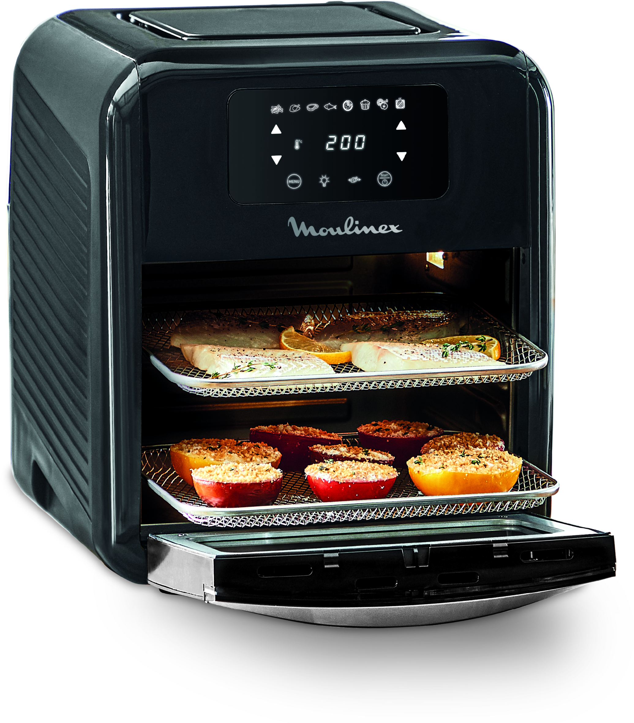 9 EN 1: un único producto que ofrece unos resultados perfectos: fríe con aire, asa, cocina al grill, hornea, asa a la parrilla, deshidrata, tuesta, cocina con asador y recalienta AHORRO ENERGÉTICO: Ahorra hasta un 70% de energía* con nuestras freidoras sin aceite. Cocina más rápida, más económica y menor consumo de electricidad. APP MOULINEX: Inspírate cada día gracias a la aplicación gratuita de Moulinex con más de 150 recetas deliciosas que puedes preparar con tu freidora sana. 9 PROGRAMAS AUTOMÁTICOS: patatas fritas, pollo, carne, pescado, pizza, pasteles, deshidratar y asar al grill GRILL: parrilla de aluminio fundido a presión para unos resultados óptimos COCCIÓN RÁPIDA: cocina un 30 % más rápido y con más eficiencia energética que un horno clásico [Prueba externa realizada con 700 g de patatas fritas congeladas, en comparación con un horno de convección de Moulinex/Tefal] HASTA 3 COMIDAS A LA VEZ: gracias a sus múltiples bandejas 7 ACCESORIOS: 2 rejillas, cesta para patatas fritas, bandeja de goteo, asador para pollo, varillas para extraer accesorios y bandeja de grill con mango extraíble GRAN CAPACIDAD: capacidad de 11 L, para hasta 6 raciones CONTROL DE TEMPERATURA: de 45 °C a 200 °C, para unos resultados perfectos FÁCIL DE LIMPIAR: piezas aptas para lavavajillas TEMPORIZADOR: hasta 60 minutos para cocinar cómodamente y hasta 24 horas en el modo deshidrata