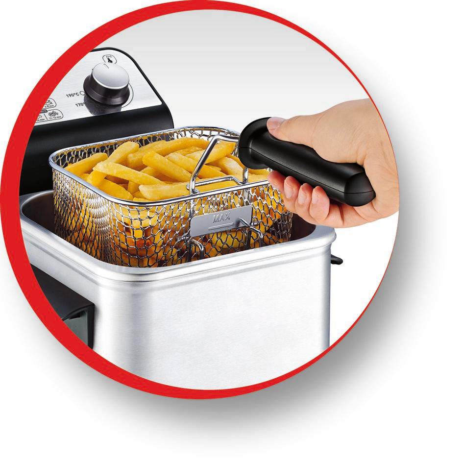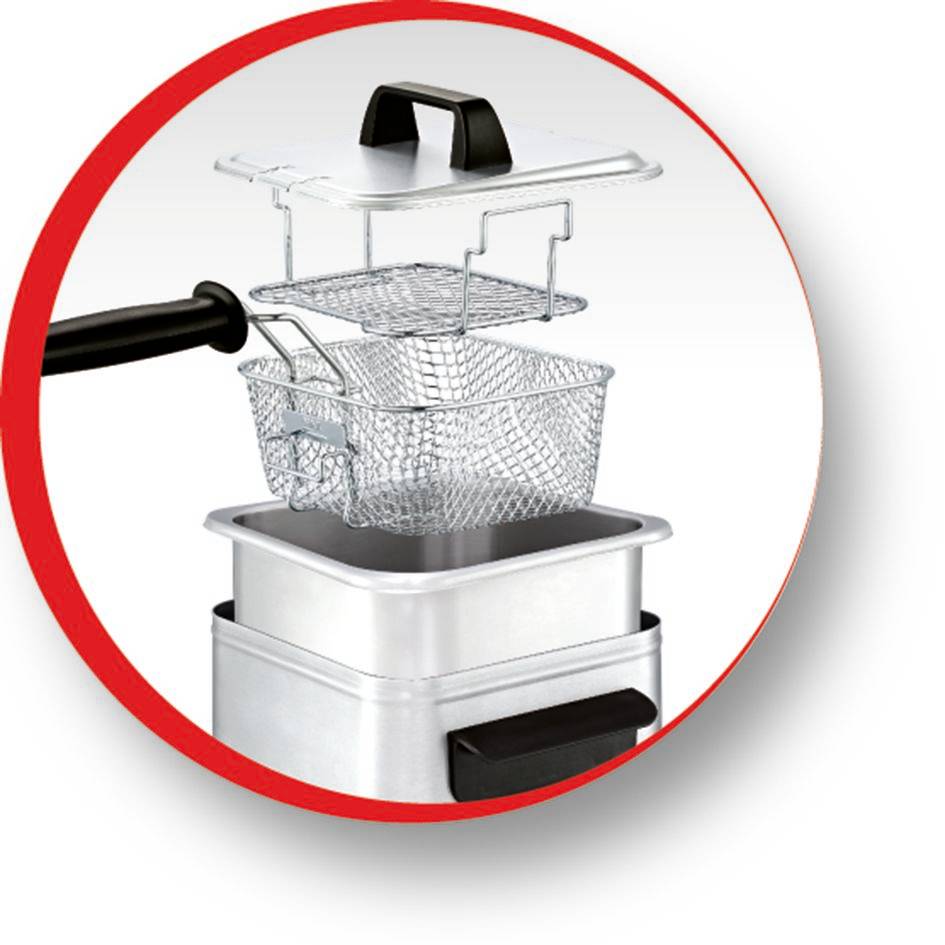 Compact Pro es una freidora semiprofesional con tecnología de zona de toque frío y una potencia de 1700 W. Con su capacidad para 2 l de aceite puede freír hasta 600 g de deliciosos aperitivos, como una profesional. Dispone de una resistencia sumergida para unos resultados rápidos y excelentes. Su cuba de acero inoxidable es extraíble, por lo que es muy fácil de usar y de limpiar. Compact Pro puede desmontarse por completo y todos sus componentes, excepto la resistencia, son aptos para el lavavajillas. Puedes ajustar la temperatura de 150°C a 190°C, y dispones de un accesorio exclusivo para freír en 2 niveles dentro de la cesta y evitar que los aperitivos se peguen. ¡Antes de la Compact Pro nunca había sido tan fácil freír como un profesional y obtener resultados profesionales!