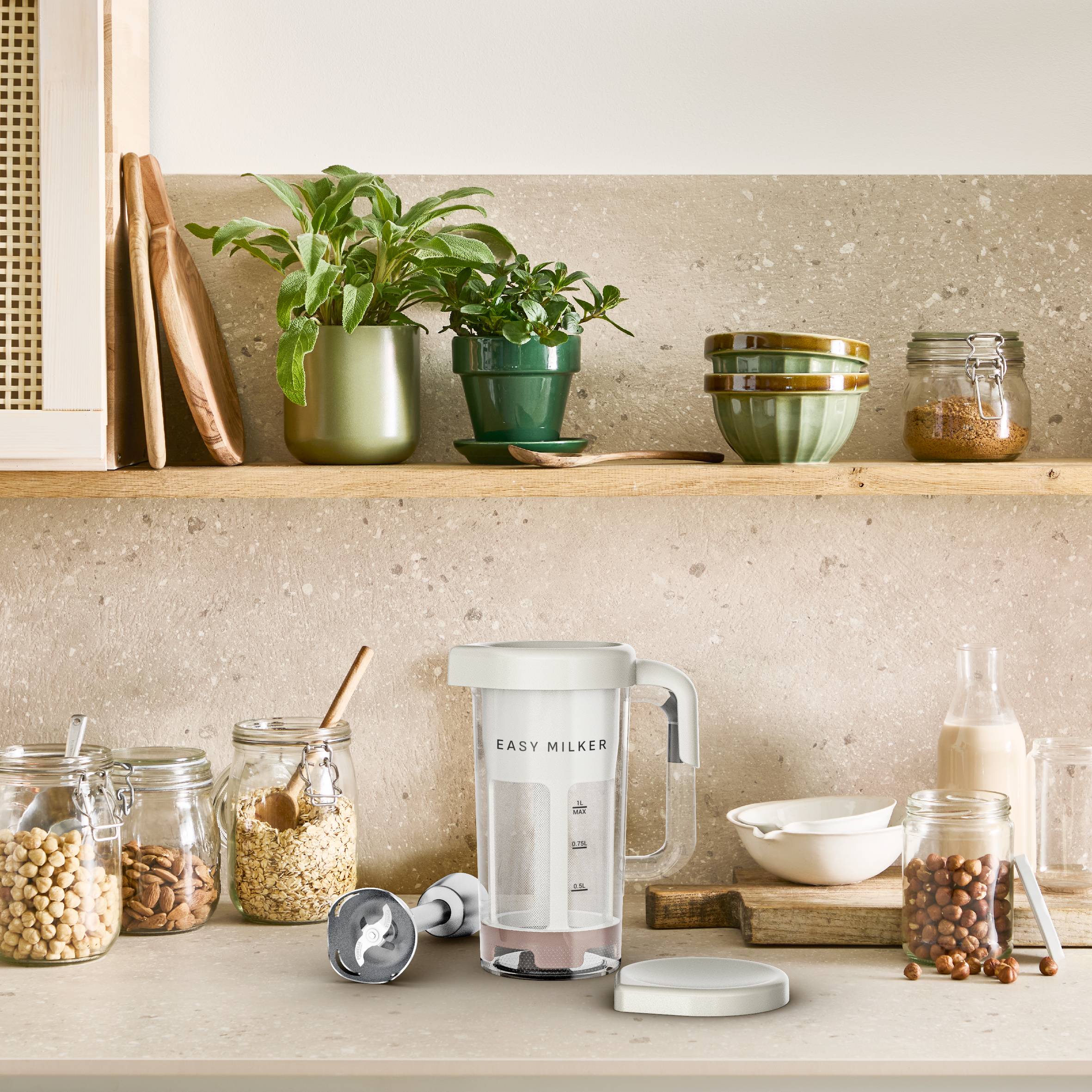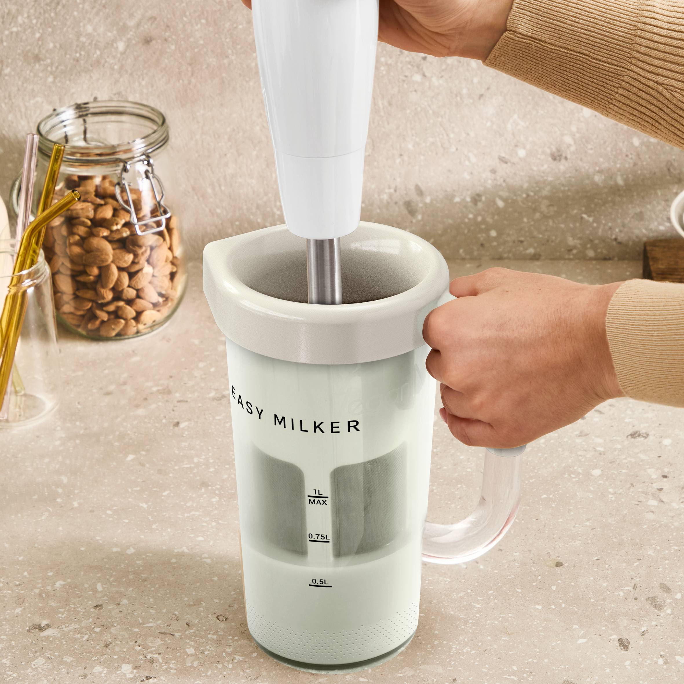 Descubre la nueva forma de preparar bebidas vegetales caseras y sanas. Easy Milker es compatible con todas las batidoras de mano* domésticas, ofreciendo resultados rápidos y fáciles al instante. Disfruta de recetas personalizadas y reutiliza la pulpa para evitar desperdicios: un sinfín de posibilidades. La limpieza es muy sencilla gracias a la base extraíble y a su diseño apto para el lavavajillas.