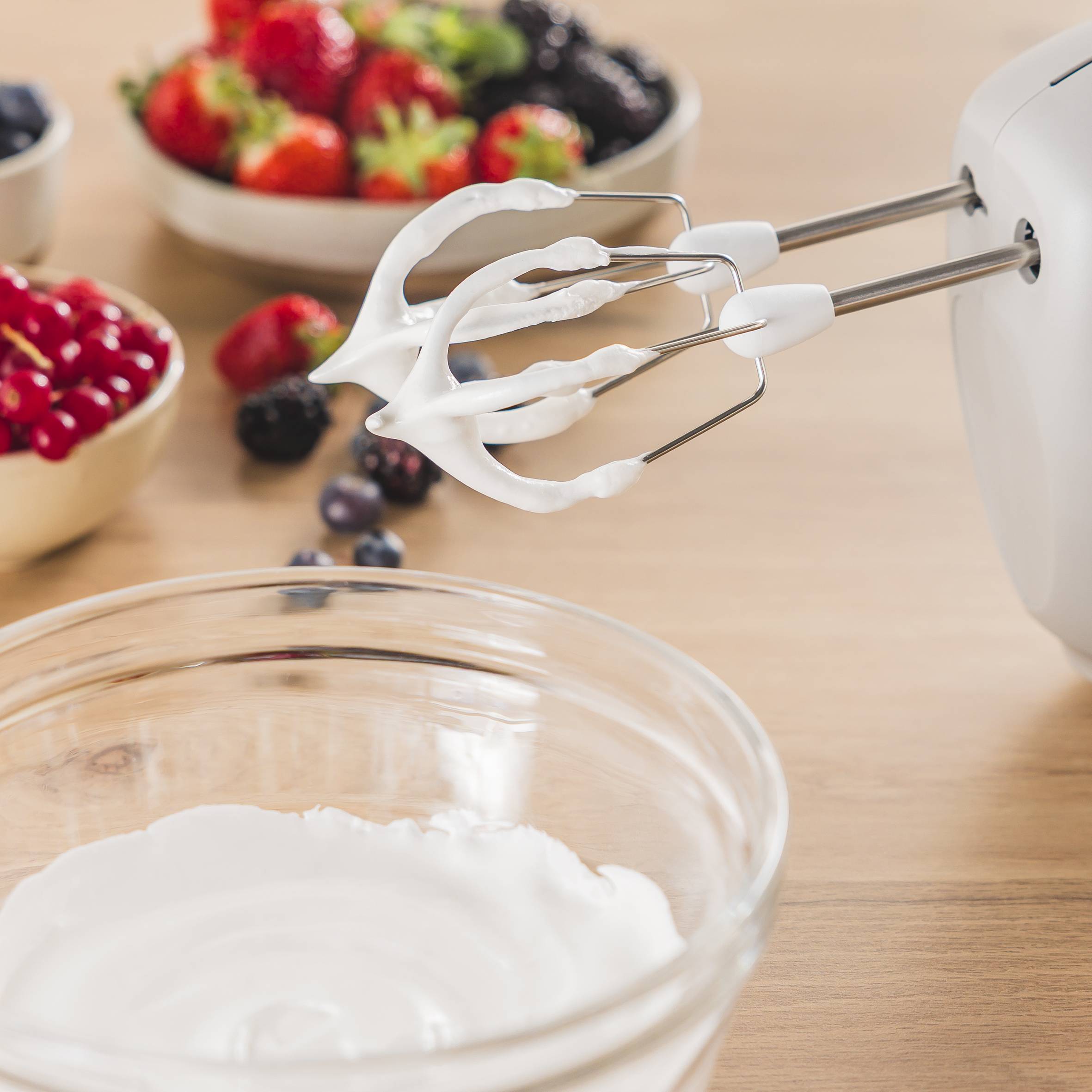 Desde claras de huevo batidas hasta cremas y salsas irresistibles, Easy Max ofrece grandes resultados. Nuestra batidora amasadora compacta combina alto rendimiento con una gran facilidad de uso e incluye dos versátiles juegos de varillas. Las varillas de acero inoxidable garantizan una mezcla impecable de claras de huevo, cremas y mucho más, mientras que las varillas emulsionadoras garantizan salsas rápidas y perfectas.