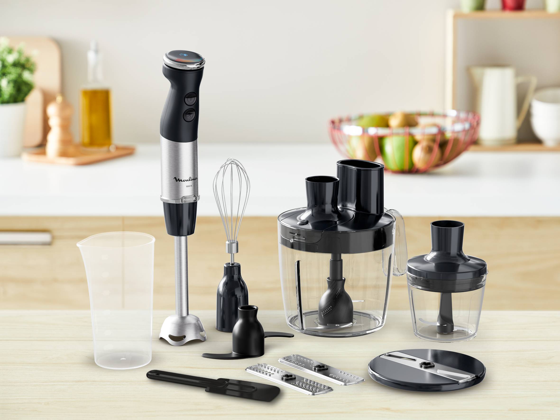 La batidora de mano Quickchef+ de Moulinex ofrece un rendimiento excepcional y un control total. La exclusiva tecnología Powelix garantiza una cremosidad increíble con resultados hasta un 30 % más rápidos*, para conseguir texturas suaves y uniformes sin esfuerzo, ¡incluso con los ingredientes más duros! Descubre la máxima versatilidad gracias a un completo kit: un procesador de alimentos 5 en 1, una picadora compacta y unas varillas, además de 20 velocidades variables y un modo turbo regulables mediante un selector fácil de usar.